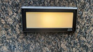 施工前のフットライト。この器具を4灯交換しました。 ほぼ同じ大きさのLED器具を用意しました。 照明具を外したところ。 照明器具を取り付けて、周りをコーキングします。 施工後はこんな感じでバッチリ決まりました。